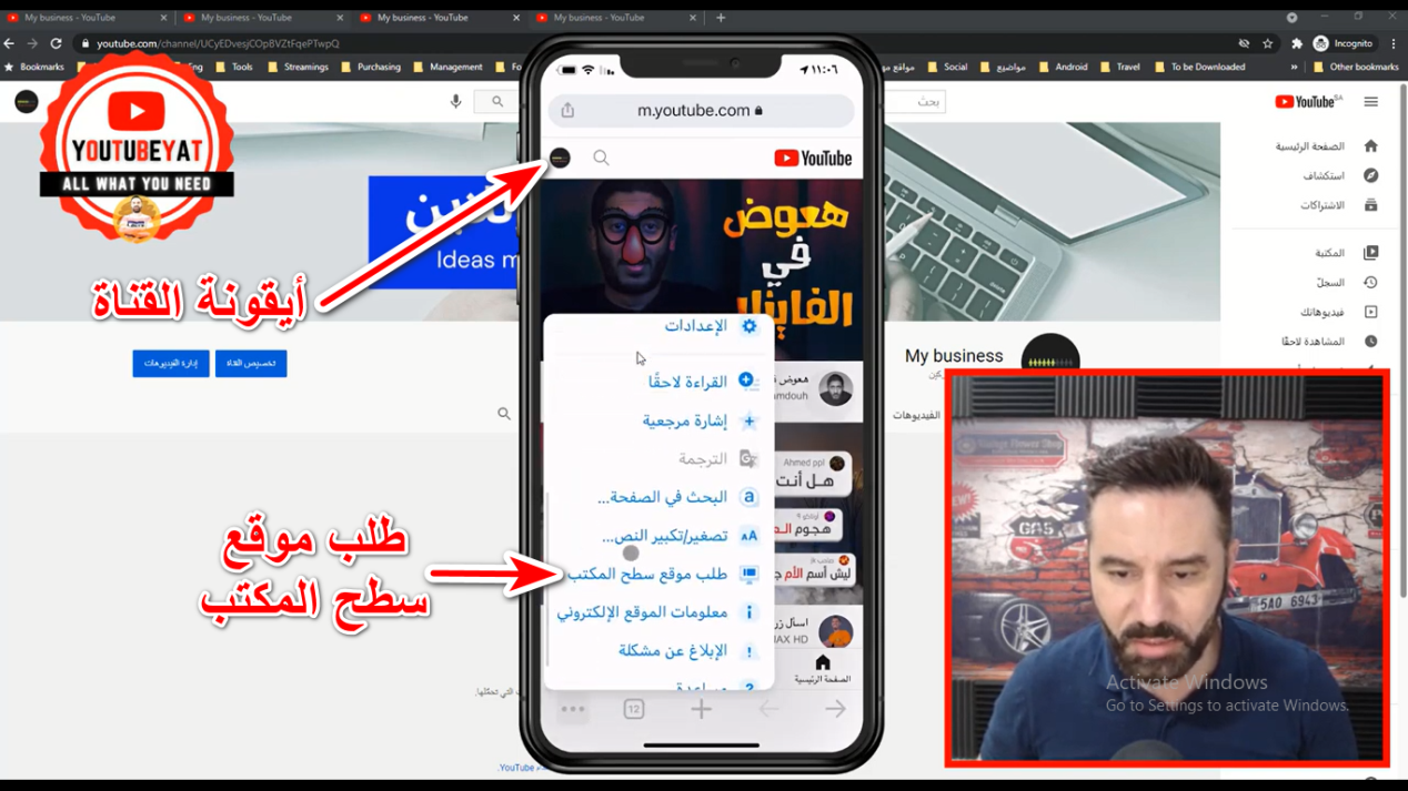 - فعندما تقوم بفتح قناتك من الهاتف (ولا تنسى تحديد طلب موقع سطح المكتب) والضغط على أيقونة القناة، ثم الإختيار (قناتك).