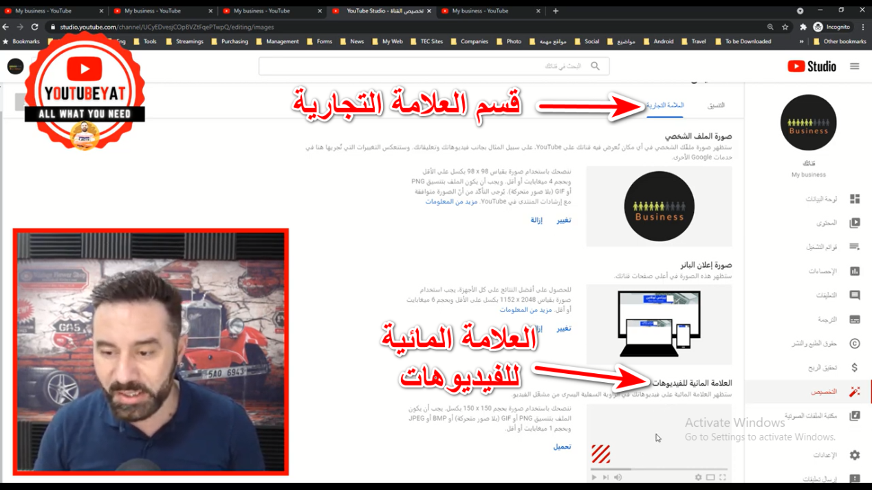 - إضغط على (تخصيص القناة)، حيث يظهر لك إختيار (العلامة المائية للفيديوهات) الموجود داخل (العلامة التجارية).