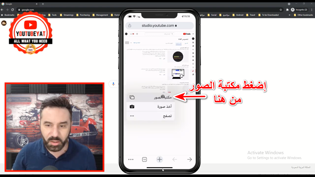 - وبالرجوع للقناة مرة أخرى والضغط على (تحميل) في إختيار العلامة المائية للفيديوهات، ثم (مكتبة الصور) وإختيار صورة علامة الإشتراك التي قمت بتحميلها ثم إضغط على (إختيار)، ثم (تم).