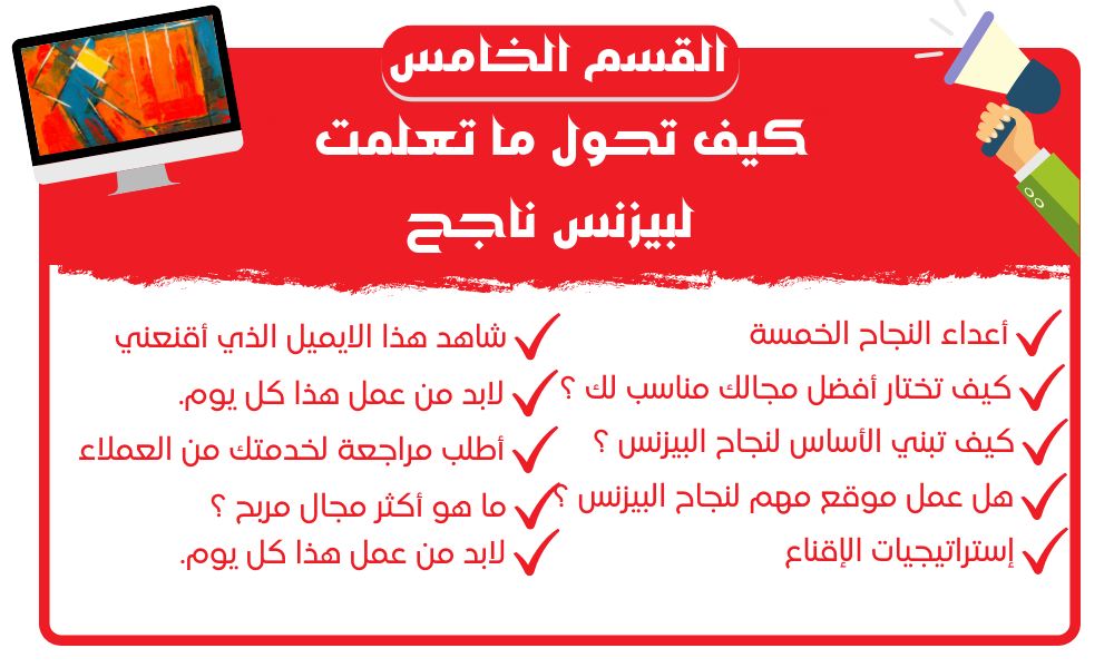 أهم شيء في نجاح أي بيزنس هو أختياره بالشكل الصحيح بناء على مهاراتك ومهارات فريق عملك و الطلب في السوق الحالي ثم تبدأ بسرد ما تحتاج لتطور من مهارات لتكون ناجح في هذا المجال. وتحتاج ليكون لديك نقطة تميز في السوق عن غيرة وهذا مشروح ايضا في هذا الكورس باستراتيجيات ناجحة ومجربة.